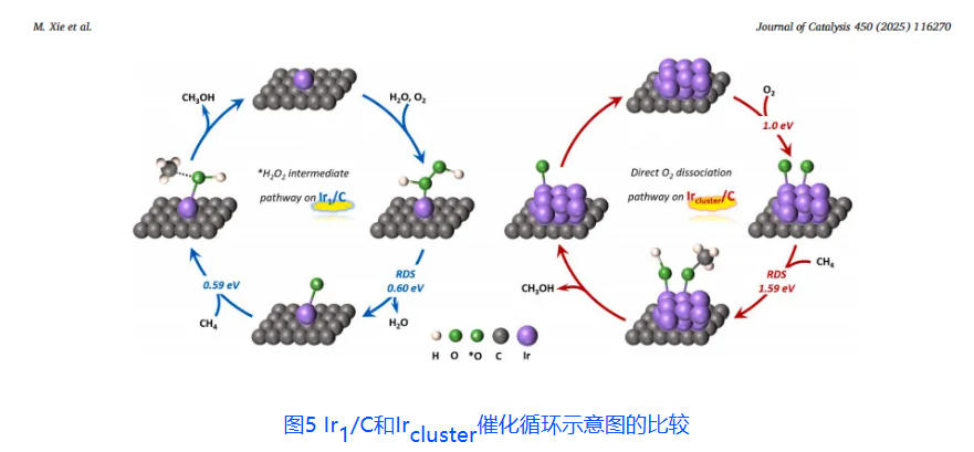(3)相反,Ir团簇催化剂(Ircluster/C)通过Yeager/Griffiths型吸附导致O₂直接解离形成强Ir-O键,其CH₄活化能垒较高(1.59 eV)。