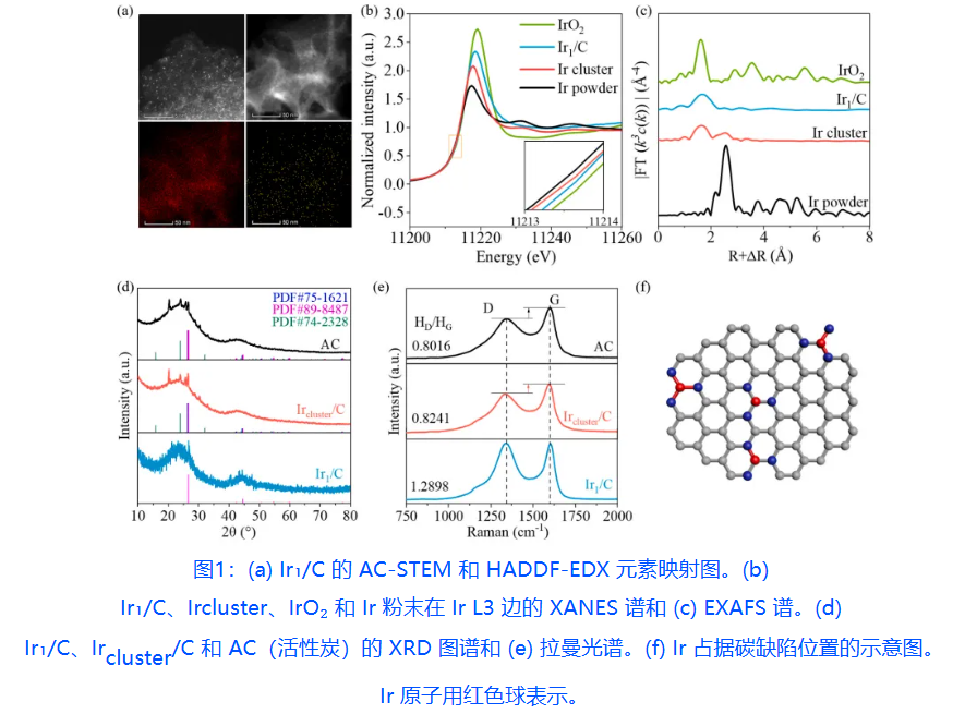(1)成功构建了碳负载的单原子铱催化剂(Ir₁/C),其Ir原子与三个碳原子配位形成Ir-C3结构。
